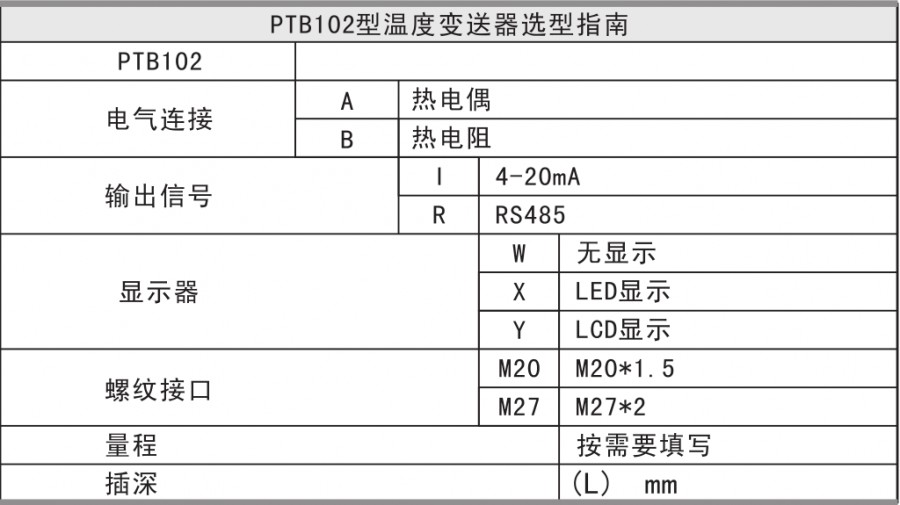 PTB102采用進(jìn)口溫度敏感元件,經(jīng)過(guò)專用集成電路處理,輸出4-20mA電流信號(hào)及RS485數(shù)字信號(hào)。產(chǎn)品具有精度高、穩(wěn)定性好、壽命長(zhǎng)、可靠性高、安裝方便等特點(diǎn)。適用于石油、化工等行業(yè)進(jìn)行流體溫度的測(cè)量。